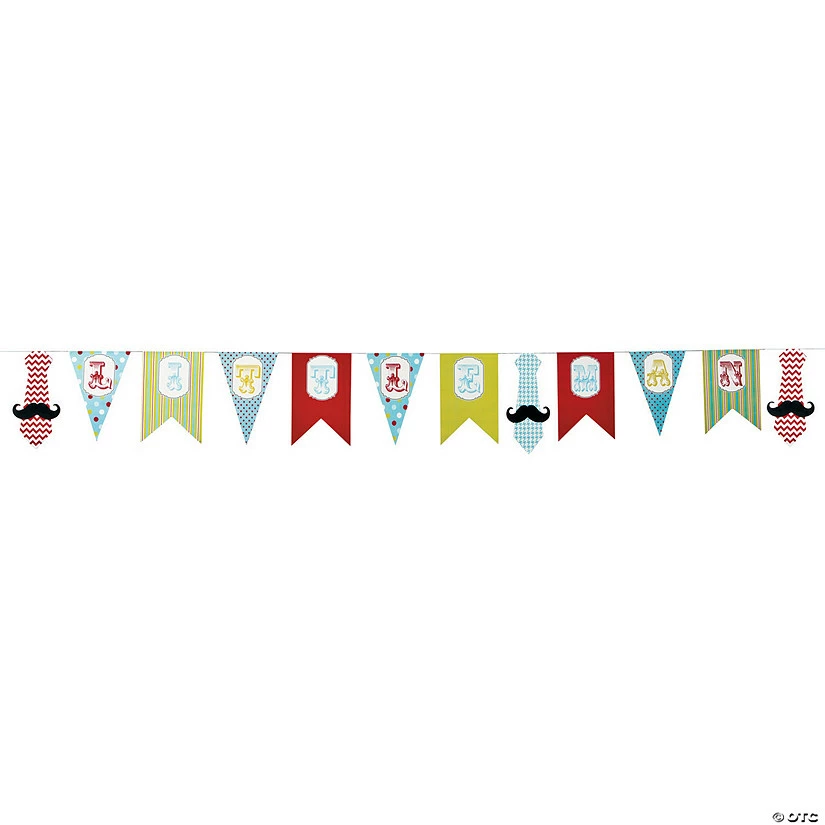 Adorable neck ties, cute mustaches and patterned flags make the Little Man Pennant Banner a wonderful addition to your party supplies. Hang from the ceiling, above the door or on the wall for a festive banner that will put the finishing touch on your party decorations. Coordinate with other party supplies for a complete look. Cardboard. Includes 5″ – 7″ pennants on a 7 ft. string. Β© OTC