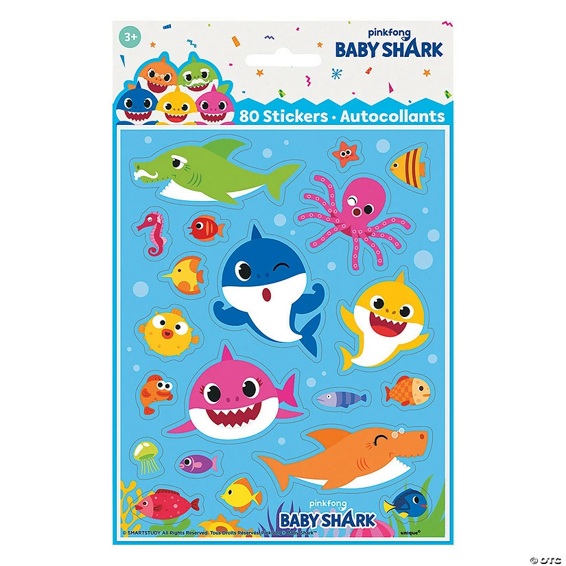 Perfect for Baby Shark party supplies, at-home kidsβ crafts or classroom rewards, these sticker sheets feature all of your favorite Pinkfong Baby Shark characters like Mommy Shark, Daddy Shark, Baby Shark, Grandpa Shark and Grandma Shark, along with several other sea creatures and fish swimming around. Paper. (20 assorted stickers per sheet, 4 sheets per unit) 5 1/2″ x 8″