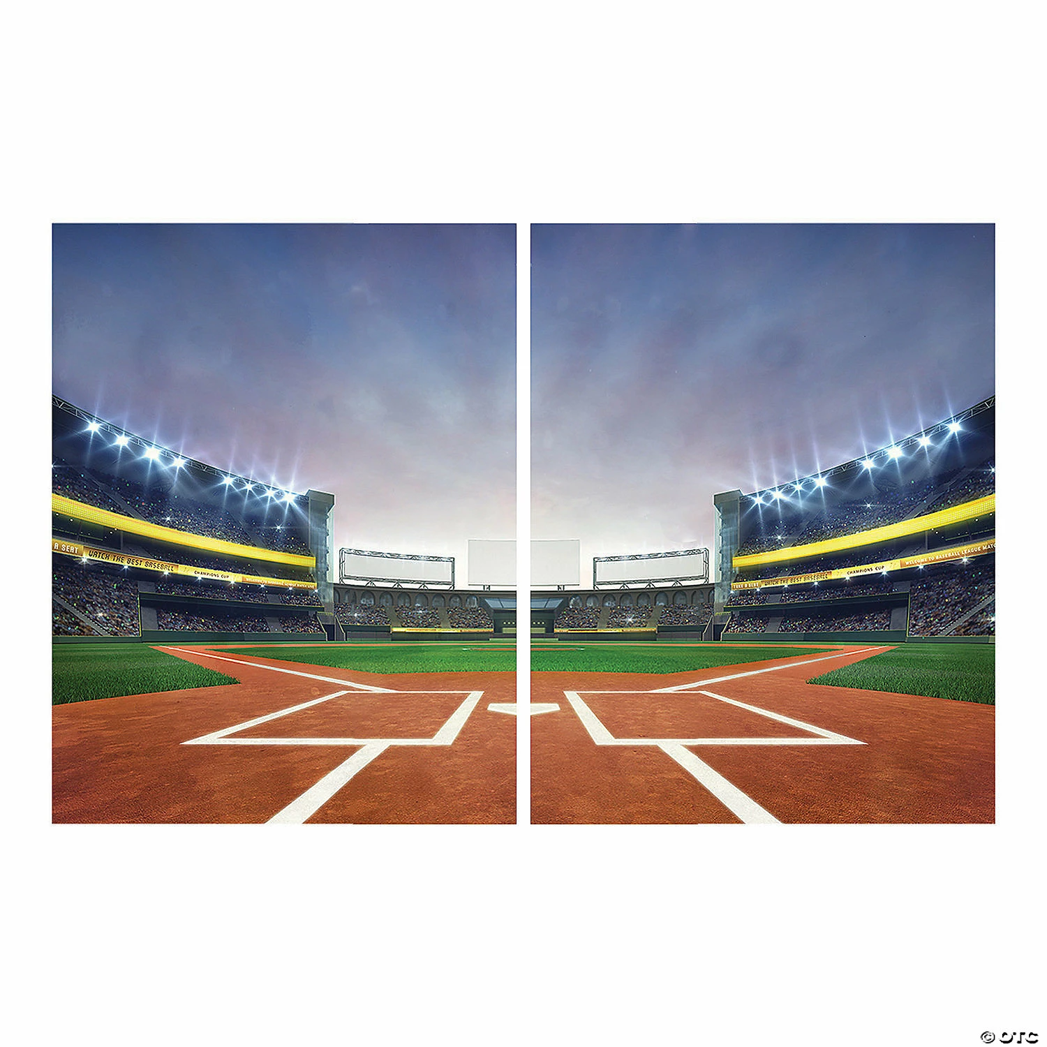 When you canβt take the party to the baseball field, bring the baseball field to the party! This impressive backdrop looks like a baseball field at dusk and is great as a photo backdrop or as a wall decoration at a sports themed party. Great for post-season celebrations for players on a baseball team, this backdrop transforms the party space into the old ball game. Plastic. (2 pcs. per set) Assembled, 9 ft. x 6 ft. Simple assembly required. Β© OTC