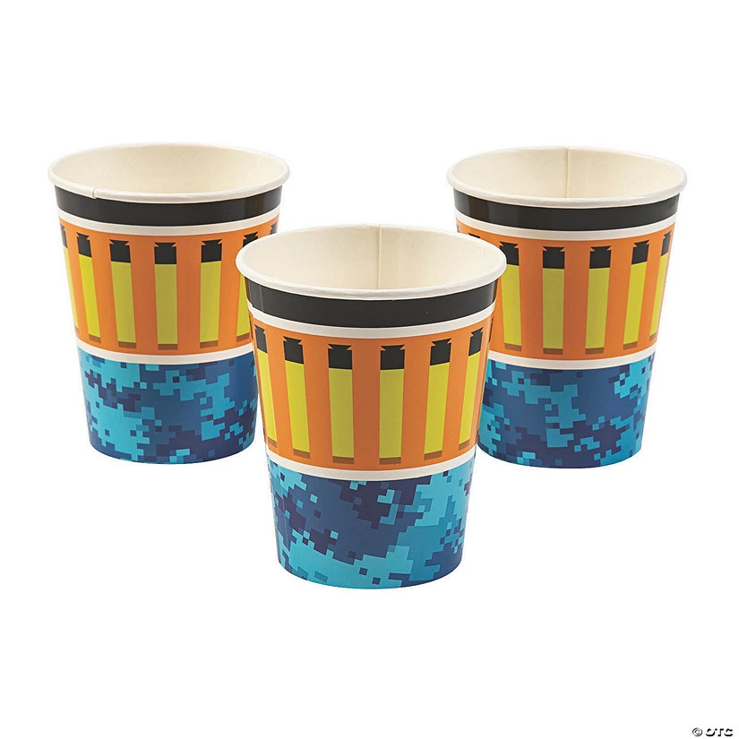Boys will work up a thirst after a long Dart Battle Party, so be sure to stock up on cups to match your little guyโs birthday theme! Printed in bold orange and a unique blue camouflage, these cups will really pop on your tablescape! Place a stack of cups near the juice for those extra thirsty foam dart-battling boys! Paper. (8 pcs. per unit) 3 3/4″ 9 oz. ยฉ OTC