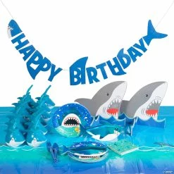 Ready to host a totally jawsome birthday party for a kid who loves sharks? This helpful tableware kit comes with enough disposable shark-themed tableware and decorations for a shark party of up to 8 guests. Make the process of planning a shark-themed birthday party so much easier by getting everything you need in one complete kit. (64 pcs. per unit) Assortment may vary. Β© OTC Includes:β’ 16-Pc. Plastic Blue Fork & Spoon Cutlery Setβ’ 1 Plastic Jawsome Shark Tablecloth (54″ x 108″. Disposable.)β’ 12 Plastic Molded Jawsome Shark Cups with Lids & Straws (3 3/4″ 6 oz.)β’ 2 Foam Shark Centerpieces (13 1/2″ x 13 1/2″ x 11 3/4″ Simple assembly required.)β’ 1 Cardstock with Plastic Twine Shark Birthday Party Garland (8 ft. x 12″)β’ 16 Paper Shark Party Beverage Napkins (5″)β’ 8 Paper Shark Party Dinner Plates (9″)β’ 8 Paper Shark Party Dessert Plates (8″)