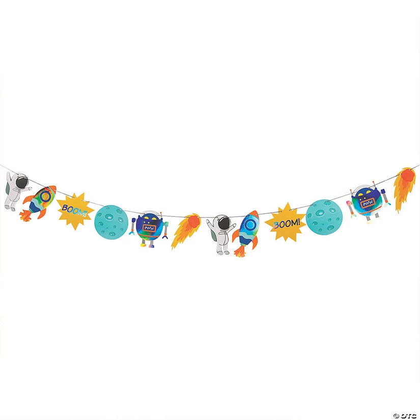 Blast off towards the best birthday ever! With shimmering designs of rockets, planets and more, this garland makes space birthday party dΓ©cor downright supernova. Simply hang behind the buffet table or as part of a DIY photo booth backdrop to send your wannabe astronauts to the moon! Paper. 6 ft. Β© OTC