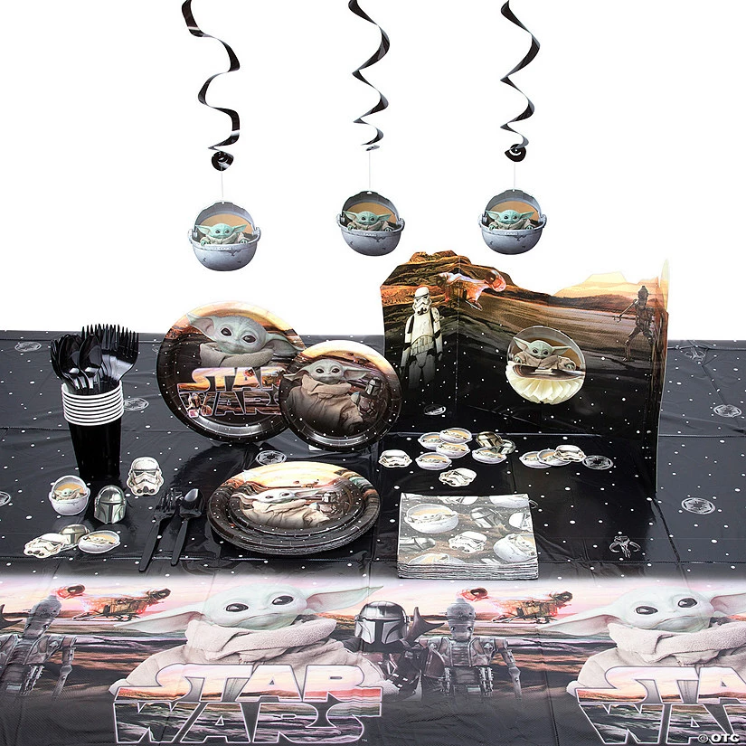 Gather the children together to party with the most famous Child from Star Wars™ The Mandalorian™. This tableware kit makes it easy to host a fun Star Wars™ The Madalorian™ birthday party for up to 8 kids (or kids at heart!). Featuring enough disposable cups, cutlery, plates, napkins and more, this kit simplifies party planning by providing everything in one easy purchase. (97 pcs. per unit) Assortment may vary. © & ™ Lucasfilm Ltd. All Rights Reserved.Includes:• 24 Paper Cups (3 3/4″ 9 oz.)• 2 Plastic Fork & Spoon Cutlery Sets (16 pcs. per unit)• 8 Paper Star Wars™ The Mandalorian™ Dessert Plates (7″)• 8 Paper Star Wars™ The Mandalorian™ Dinner Plates (9″)• 3 Paper Star Wars™ The Mandalorian™ Hanging Decorations (6 3/4″ x 7 3/4″)• 1 Cardstock Star Wars™ The Mandalorian™ Table Decorating Kit (Includes one 24″ x 11 3/4″ centerpiece and twenty confetti pieces.)• 16 Paper Star Wars™ The Mandalorian™ Luncheon Napkins (6 1/2″)• 1 Plastic Star Wars™ The Mandalorian™ Tablecloth (54″ x 84″ Disposable.)