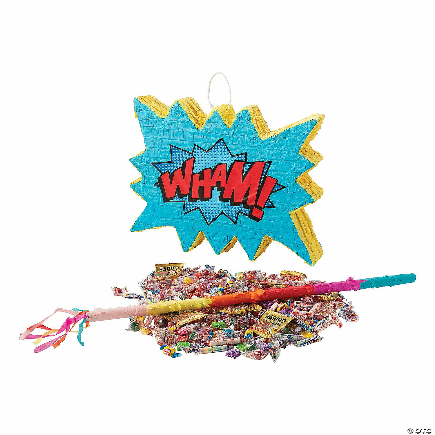 Wham! That’s the sound of you saving the day and the party with this all-in-one superhero piñata kit! Power up your superhero party supplies with this piñata set, which includes the piñata itself, pinata stick and A LOT of candy. Line up all the little heroes and have them take a swing like they’re trying to knock out the bad guys. Check out more superhero party decorations and supplies elsewhere on this website. Papier-mâché. Piñata, 23″ x 4″ x 16″; stick, 30″. Candy includes Atomic Fireball®, Rainblo Pops®, SweeTarts®, Double Bubble® Bubble Gum, Smarties®, Rainblo®, Now And Later® and more. (Approx. 208 candy pcs. per unit) Candy total wt., 56 oz. Fat-free. Dairy-free. Gluten-free. Nut-free.• Ingredient, nutrition, allergen and other product information are provided on our Web and Mobile sites for reference purpose only, without warranty or representation as to accuracy. Manufacturers adjust their labeling regularly and are solely responsible for the accuracy of the information. For general questions concerning these items, please contact our customer service at 800-228-0475.
