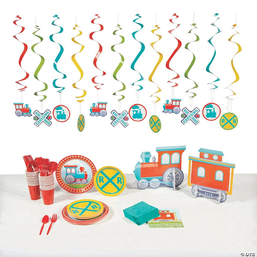 This decorations and tableware set is perfect for a little train enthusiast’s birthday party! A great addition to your party supplies, this party pack includes tableware for up to eight guests and enough train-related images to keep your celebration on track! (137 pcs. per unit) Simple assembly required. Β© OTCIncludes:β’ 1 Plastic White Tablecloth (54″ x 108″)β’ 24 Real Red Paper Cups (3 3/4″ 9 oz.)β’ 8 Red Plastic Forks (6 1/2″)β’ 8 Red Plastic Spoons (6″)β’ 50 Paper Teal Lagoon Beverage Napkins (5″)β’ 2 Foam 3D Train Centerpieces (1 engine and 1 caboose, 10″ -12″ x 10″ -11″)β’ 8 Paper Dessert Plates (7″)β’ 8 Paper Dinner Plates (9″)β’ 12 Cardstock Train Hanging Swirls (assorted designs, hangs approx. 27″ with 4″ cutouts)β’ 16 Paper Luncheon Napkins (6 1/2″)